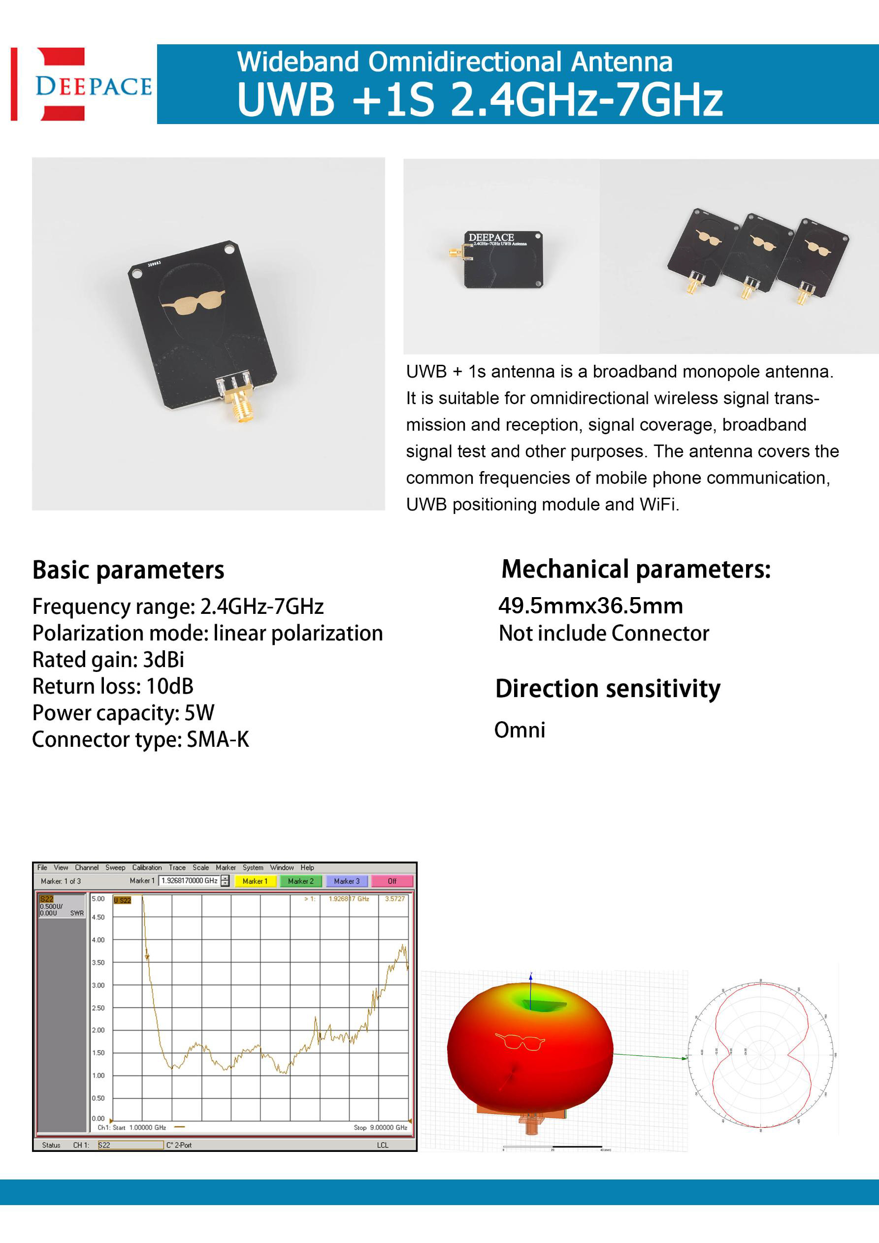DEEPACE Wideband Omnidirectional Antenna UWB-1P 2.4GHz-7GHz